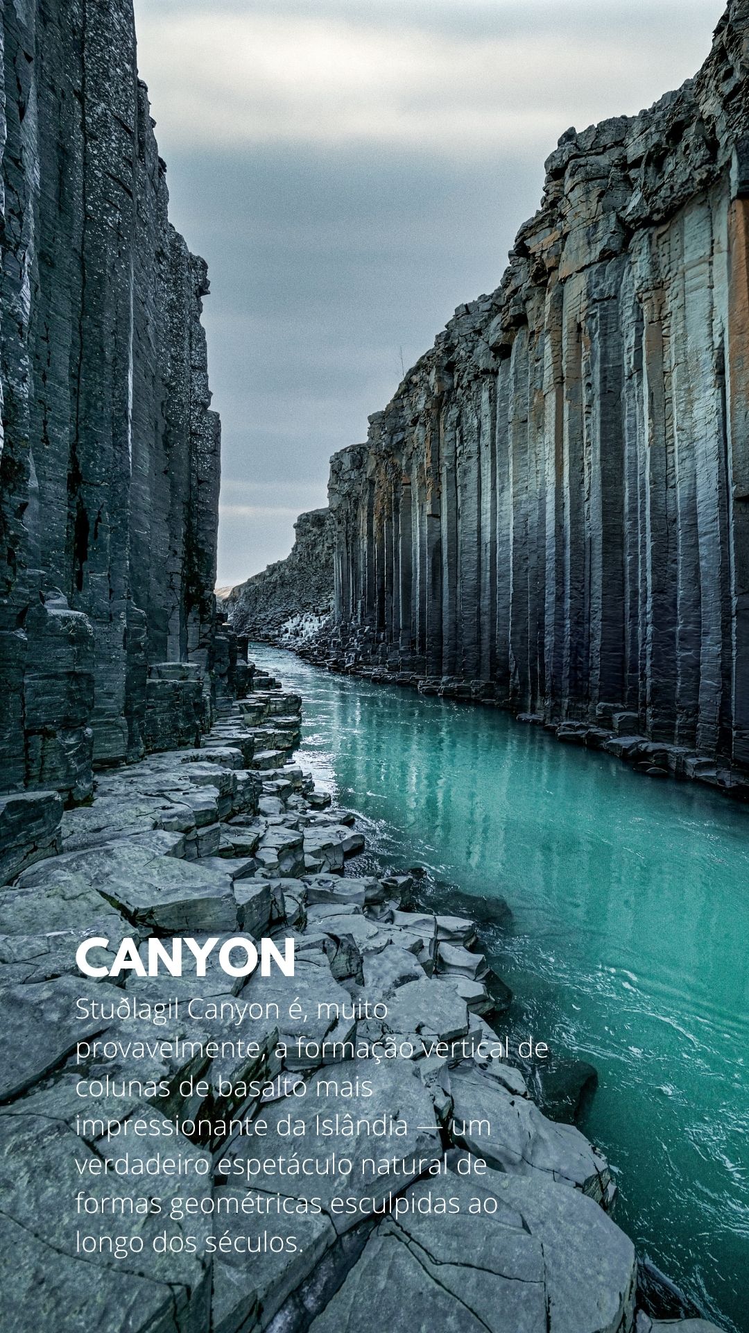 Stuðlagil Canyon é, muito provavelmente, a formação vertical de colunas de basalto mais impressionante da Islândia — um verdadeiro espetáculo natural de formas geométricas esculpidas ao longo dos séculos.
