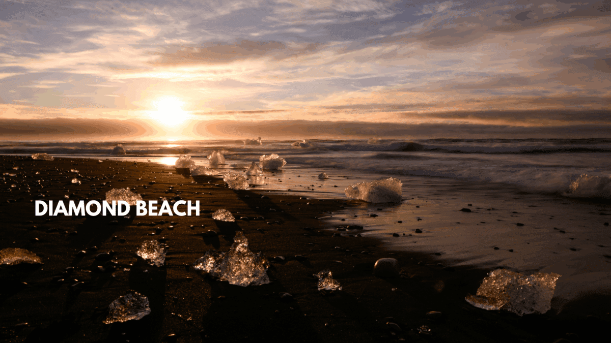 O amanhecer na Diamond Beach é um espetáculo visual: blocos de gelo trazidos pelo mar repousam sobre a areia preta, criando um contraste surreal entre o brilho cristalino e o fundo vulcânico.